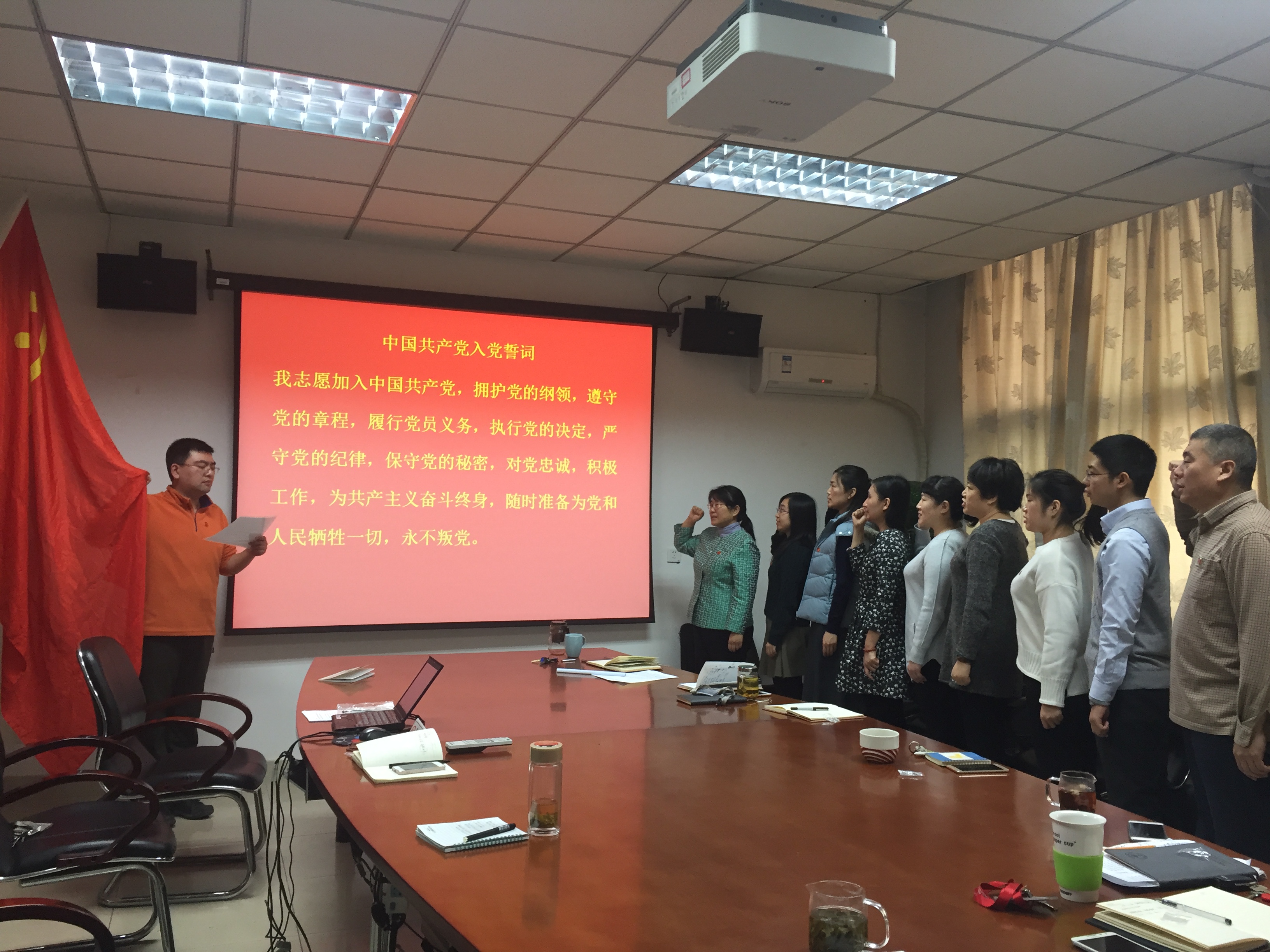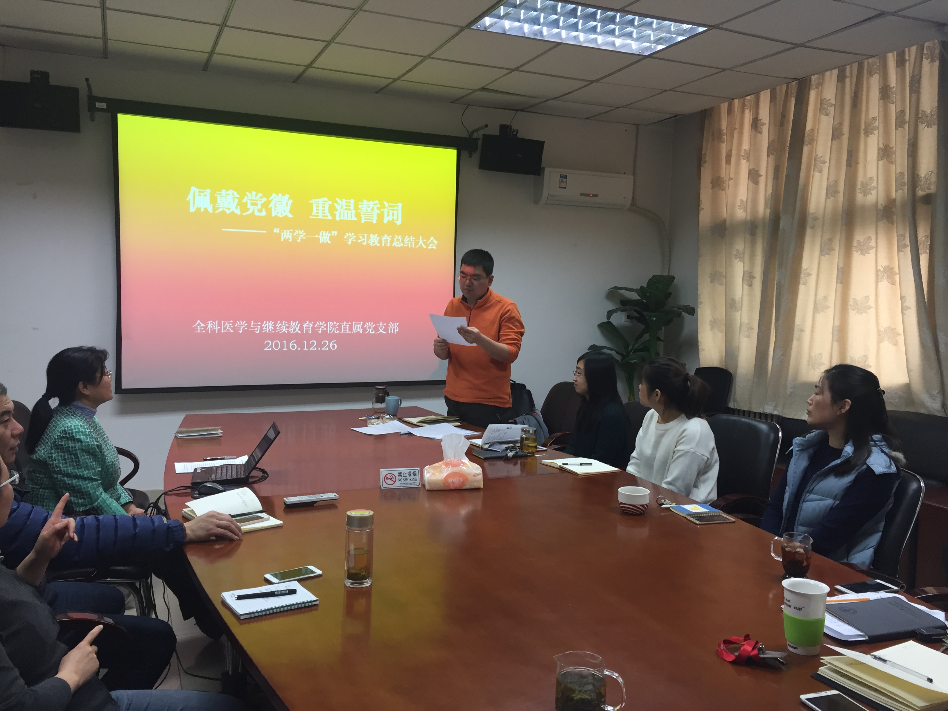直属党支部全体党员在阶平楼408会议室召开“佩戴党徽 亮明身份 重温誓词 不忘初心”主题党日活动暨党支部“两学一做”学习教育阶段总结大会。会议由原全科与办公室党支部书记胡月同志主持。